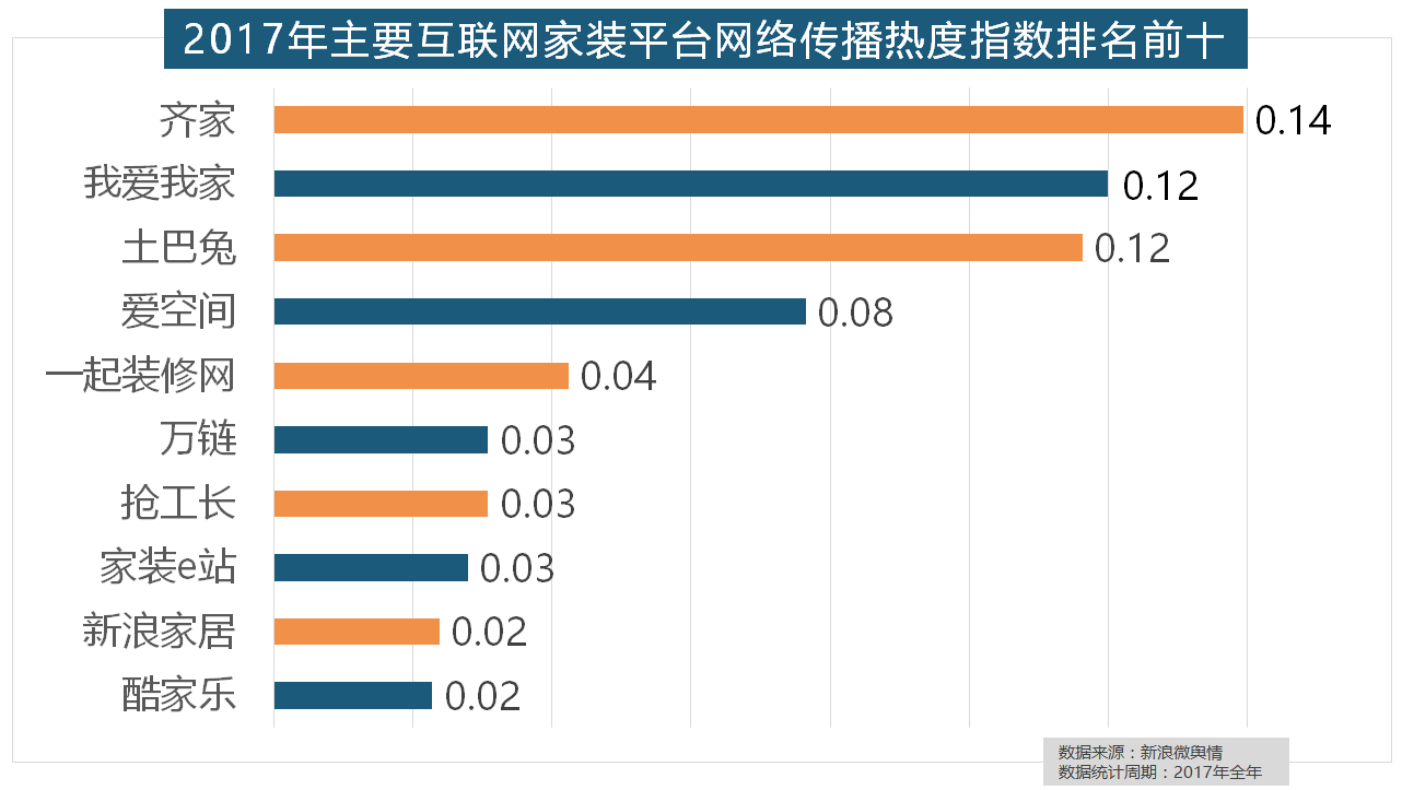 除各保守家拆设想企业逐鹿我国度拆市场外,此中,齐家、我爱我家、土巴兔、爱空间、一路拆修网的收集热度指数排名前五,此外,收集热度指数同比增加22.57%,2017年,统计对象不包含家具及家电品牌正在次要家拆产物类别热度方面,据新浪微舆情大数据阐发显示,立邦、三棵树、多乐士的收集热度指数最高,进口品牌全面占领了年度开关、插座类品牌热度榜,拆修气概、样式及拆修成本成为对拆修最为关心的方面。